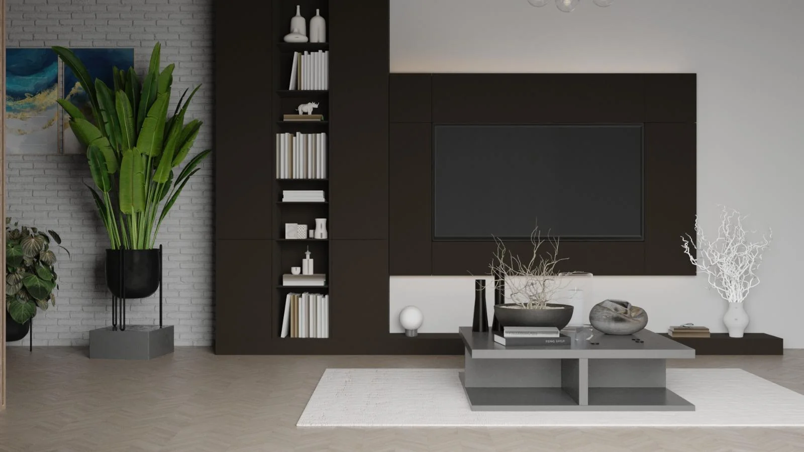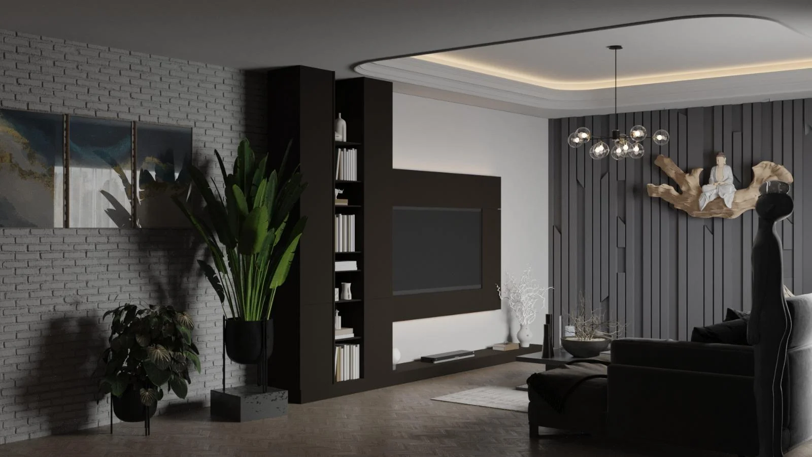 Bu salon tasarımı, koyu tonların hakim olduğu modern ve sofistike bir atmosfer sunmaktadır. Duvar kaplamalarındaki geometrik detaylar ve doğal ahşap heykel, mekana sanatsal bir dokunuş katarken, geniş oturma alanı ve şık mobilyalar konforu ön planda tutmaktadır.